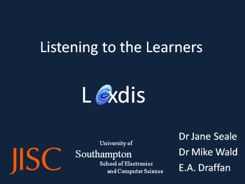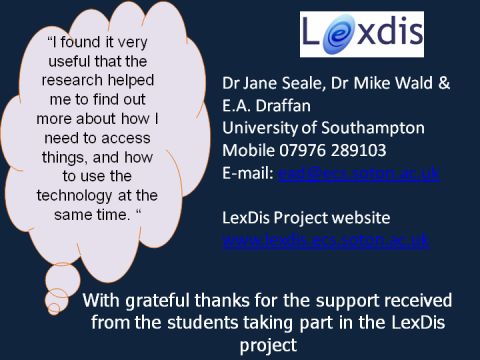 Dr Mike Wald and Mrs E.A. Draffan,<br />Electronics and Computer Science.<br />University of Southampton<br />Mobile 07976 289103<br />E-mail: ead@ecs.soton.ac.uk<br /><br />LexDis Project website<br />www.lexdis.ecs.soton.ac.uk