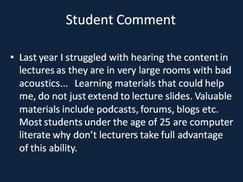 "Last year I struggled with hearing the content in lectures as they are in very large rooms with bad acoustics... Learning materials that are needed do not just extend to lecture slides. Valuable materials include podcasts, PowerPoint's, the use of blackboard, discussion boards and many more. The fact that the majority of people under the age of 25 are computer literate shows exactly why lecturers should be taking full advantage of this ability most of us possess."