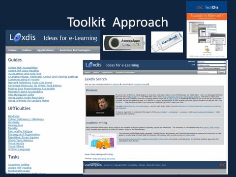 The JISC funded LexDis project, in participation with a group of disabled students at the University of Southampton, has resulted in the feeling that there needs to be a broad brush approach to advising students on the types of technologies to support their on-line learning. It is also proposed that a toolkit approach is required for academic staff supporting the concepts of inclusivity. During the workshop the contents of the kit will be discussed and there will be a chance to view the issues that have arisen for the LexDis participants and discuss their strategies. It is felt that the approach taken provides enhanced knowledge for both students and academic staff but requires assessors, specialist tutors, trainers and other support staff to be aware of the shifts in on-line or e-learning environments.